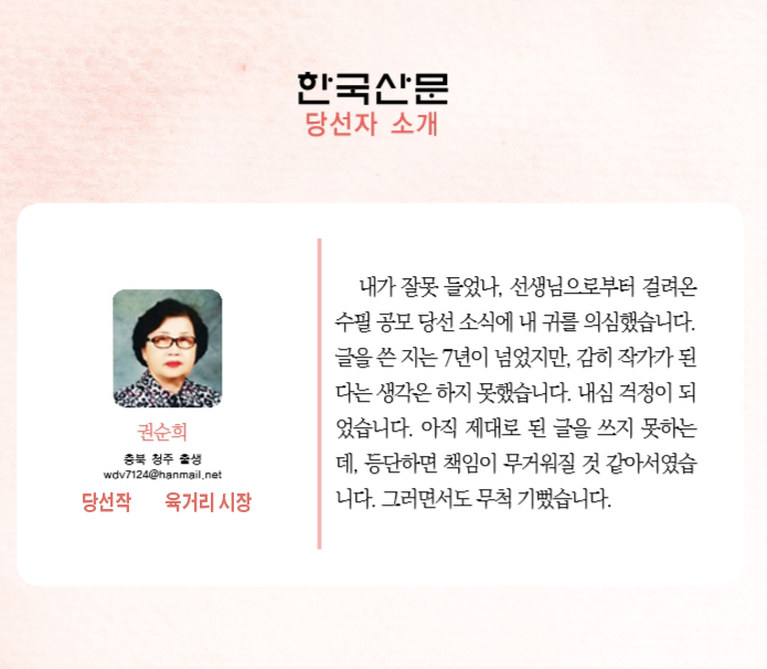 권순희 선생님 등단을 진심으로 축하드립니다. 이곳에서 청주분들을 뵈니 더 기쁘네요. 권선생님은 글 쓰기를 늦게 시작하셨지만 정말 열심히 쓰셨습니다. 7년 동안 수업하며 공모전과 백일장에서 여러번 하셨습니다. 앞으로도 문운이 활짝 열리시길 기대합니다.