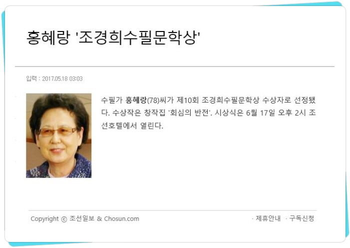 홍혜랑 님의 조경희문학상 수상 소식이 조선일보에 실렸습니다.