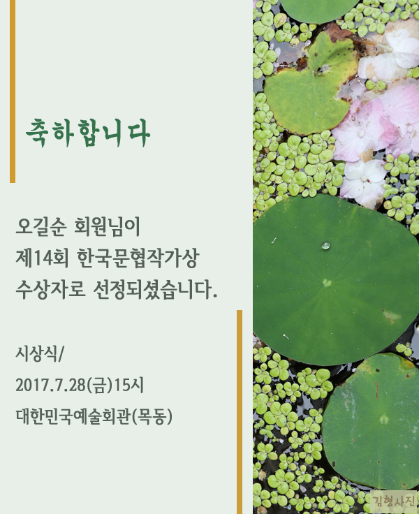 오길순 선생님, 한국문협작가상 수상 축하드려요. 기쁩니다.