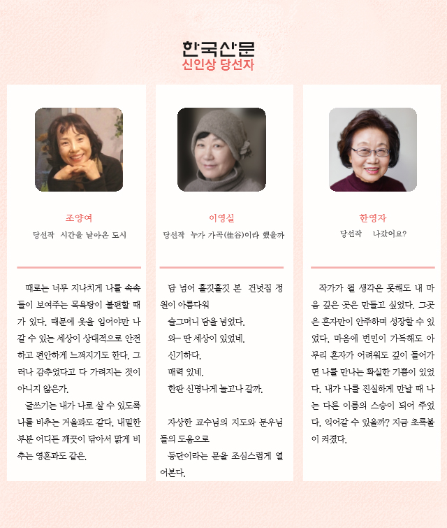 한국산문을 빛내는 작가로 계속 성장해 가시길 기원합니다~~^^