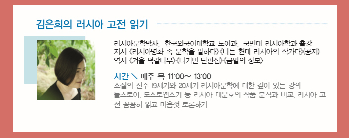 한국산문은 다양한 인문학 특강반을 운영하고 있는데, 이번에 러시아를 찾는 ‘김은희교수의 러시아고전 읽기반’이 큰 인기를 끌고 있다.