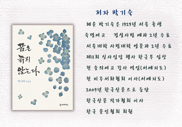 박씨는 자신의 책 제목처럼 나이가 들어서도 여전히 꿈을 꾸고 있다. 현재도 한국문인협회 회원으로 글쓰기를 소홀히 하지 않다는 그는 자신의 글을 일본어로 번역하는 작업도 스스로 하고 있다. 1929년 서울 출생으로 숙명여고와 서울대 사범대학을 졸업한 박씨는 전 미주서화협회 이사를 역임했고 현재 한국산문작가협회 이사를 맡고 있다.