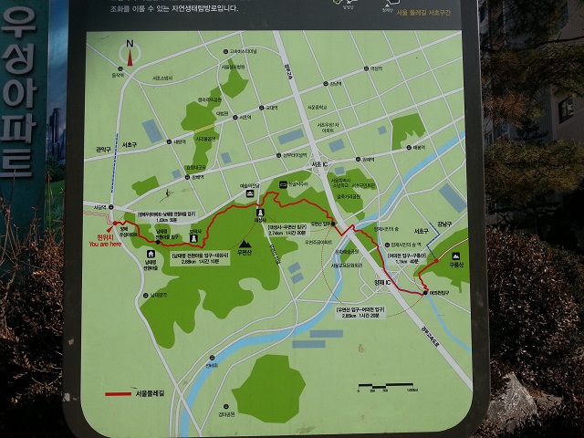 코스 : 양재시민의 숲-우면산입구 -정상(소망탑)-성산약수터-전원마을입구-사당역