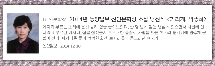 한국산문작가협회 회원이신 박종희님(청주시 거주, 분당반 소속)이 동양일보 신인문학상 소설부문에 당선되었습니다. 당선작은 <가리개>입니다. 아래 기사 링크를 클릭하시면 당선 작품을 읽으실 수 있습니다.