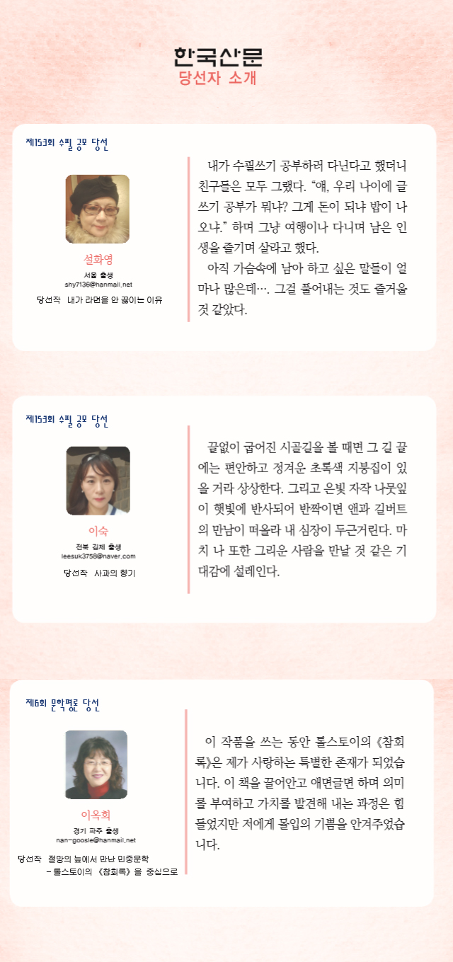 2월 등단을 축하합니다_ 설화영 님, 이숙 님, 이옥희 님