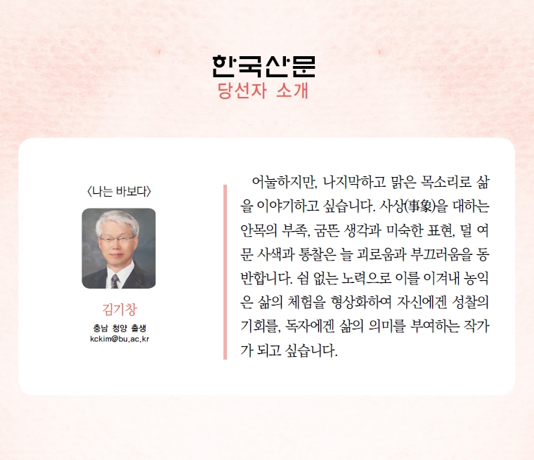 김기창 박사님, 수필가 등단을 축하드립니다. 김 박사님이 무슨 바보이신가요? 누구보다 현명하신 분인데요. 겸손한 태도가 수필가로서 좋은 미덕을 보여줍니다. 앞으로 좋은 글을 쓰는 수필가가 되시기를 기원합니다.