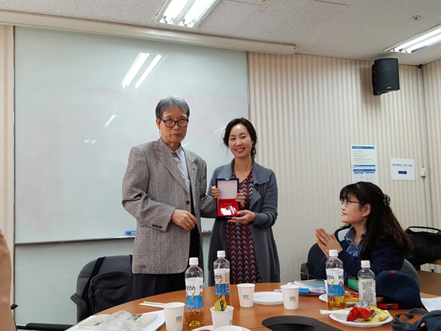 시상식장에 못온 허미희님이 교수님께 등단패를 받는 모습입니다.