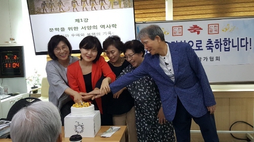 여름학기 시작하는 날, 강의실의 열기는 지난 기와 별반 다르지 않게 뜨거움~!!! 그대로입니다. 잠시 쉬는 분들과 새로 오신 분들이 약속이나 한 듯 적절한 조화가 신기합니다. 이정화님의 평론 등단 축하 케이크를 자르며 첫 날 수업은 축제 분위기로 시작했습니다. 여름학기는 늘 이렇게 아름다운 분위기이기를 바라며 다 함께 박수를, 다 함께 축하를, 다함께 맛난 식사를, 달콤한 케이크를 즐겼습니다. 이정화님 축하드리고 한턱 감사해요.파이팅~!!!