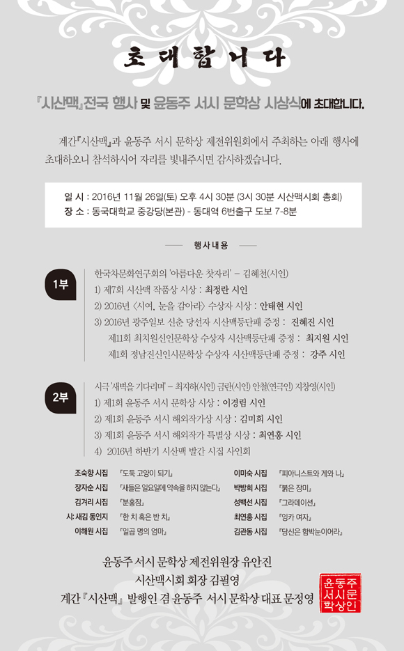 『시산맥』전국행사 및 윤동주 서시 문학상 시상식 안내
