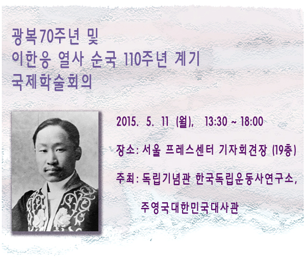 광복 70주년과 이한응 열사 순국 110주년을 맞아 독립기념관 한국독립운동사연구소는 주영국대한민국대사관과 공동으로 국제학술회의를 개최합니다.