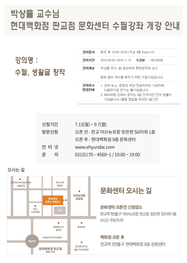 새로 오픈하는 판교 현대백화점에 박상률 교수님의 수필 강좌가 개설되었습니다.