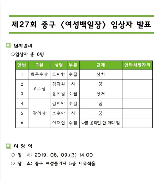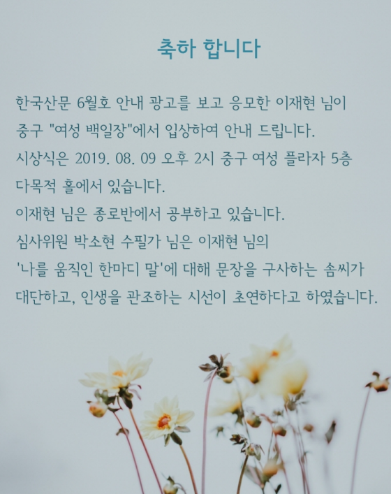 이재현 님(종로반) 중구백일장 수상 소식