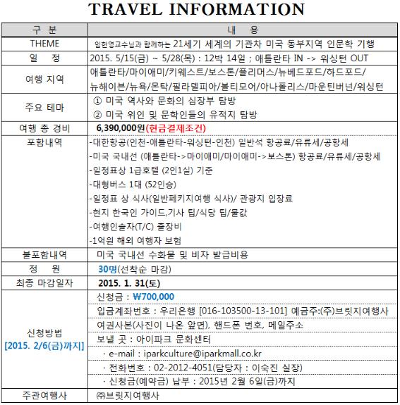 아이파크 문화센터와 브릿지 여행사가 주관하는 5월 미동부 문학 기행 신청 안내입니다.