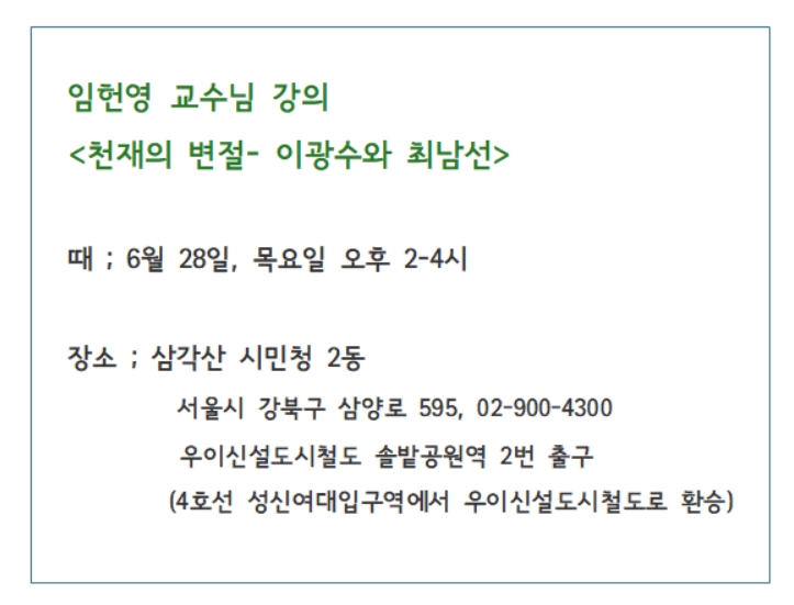 임헌영 교수님 특강 안내 (6월 28일, 삼각산 시민청 2동)