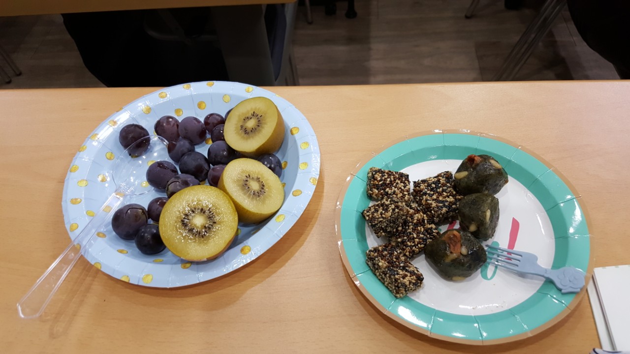 잣과 곶감을 넣어 더욱 맛났던 쑥떡과 깨강정, 과일과 식혜를 준비해주셨습니다.