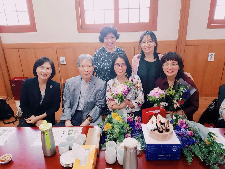 어찌나 인기가 많은지 선물과 꽃다발 천국이었지요? 많은 학우님의 축하를 받으며 카메라를 향해 포즈를 취하는 두 분의 모습이 소녀처럼 예쁘고 고우셨어요~