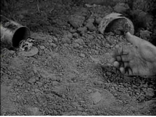 황량한 전장에 쓰러져 죽어가는 한 병사의 손이 탄피 위에 올라와 앉은 한 마리의 나비에게로 향해서 뻗어 있다.