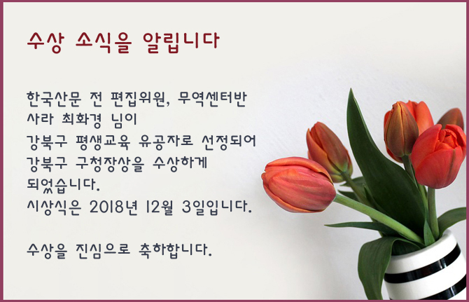 최화경 님(무역센터반)의 수상소식을 알립니다
