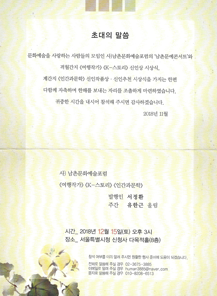 《인간과문학 》시상식, 남촌문예콘서트 행사 안내